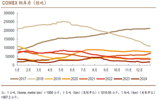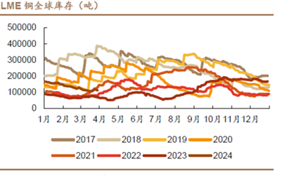 理由二: 铜的库存处在近五年的低位,有利于铜价走势。近五年来,无论是LME还是COMEX的铜库存都保持在相对较低的水平,从季节性角度来看。这种低库存状况为铜价提供了支撑。截至2024年3月底,LME铜库存为112,475吨,而COMEX铜库存为30,059吨。由下图我们可以看出2024年3月底的铜库存相较于往年的库存数低。