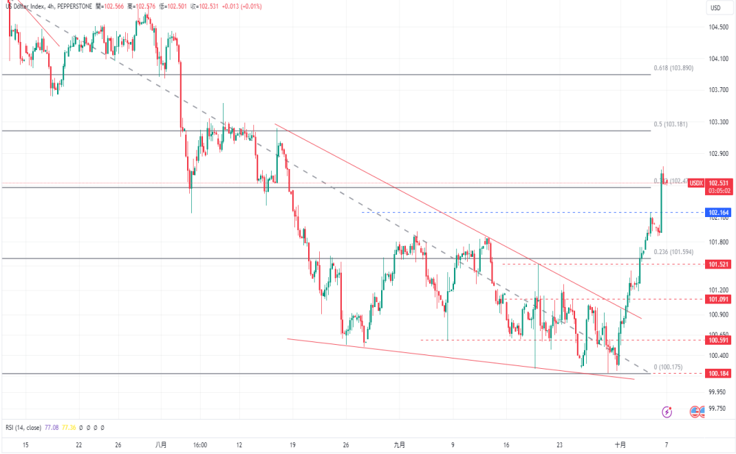 美元指数继续延续从100.238开始由下降楔形反弹的上涨趋势,若继续上涨,首先将测试103.00的关口。须注意由于RSI指数位于超买区域,因此仍存在修正的可能。