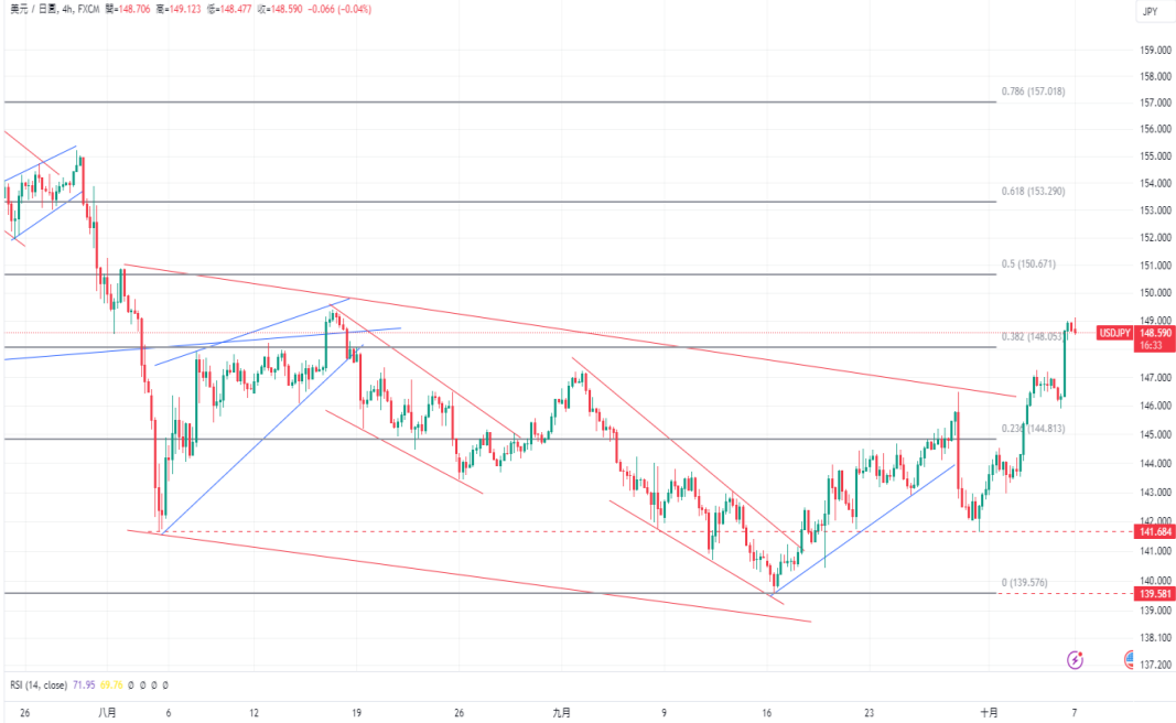 美国劳工统计局(BLS)公布最新就业后,美元兑日元持续走高,达到149.00的高位,美国劳工统计局(BLS)公布的9月就业报告显示,美国9月非农就业人数增加25.4万,超过预期的14万和上调的8月数据15.9万。非农数据公布后使得其他货币承压,追踪美元兑一篮子六种货币的美元指数(DXY)也上涨至8月中旬以来的最高点102.5上方。上周,日本首相石破茂表示,日本经济尚未做好加息的准备,日本央行的鸽派态度与美联储的相对鹰派立场,致使日元持续承压。