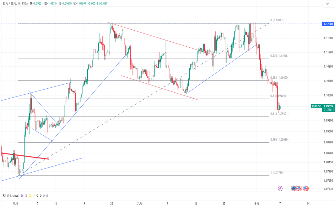 上周五,欧元兑美元跌破心理支撑位1.1000,并且在周一亚洲早盘时维持在1.097区间。美国NFP报告显示,上个月招募的求职者数量出乎意料地增加至25.4万人。超过预期的14万和上调的8月数据15.9万。同期,失业率为4.1%,低于预期的4.2%。强劲的招聘数据迫使交易员削弱了市场对联准会(Fed)11月再次进行大幅度降息的预期。由于美国9月乐观的非农业就业报告(NFP)推动美元走强,主要货币走弱,追踪美元兑一篮子六种货币的美元指数(DXY)飙升至8月中旬以来的最高点102.5上方。