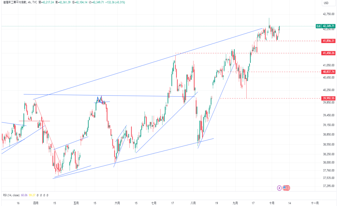 CPT Markets分析师指出,道琼指数在上周持续站稳在41850点的支撑上方后,开始重新试探上方的阻力。